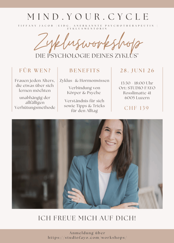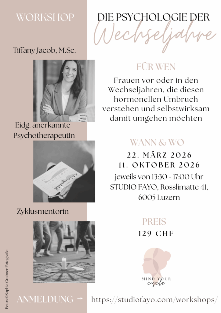 Um den Bedürfnissen von Frauen in unterschiedlichen Lebensphasen gerecht zu werden, biete ich zwei unterschiedliche Workshops an: «Die Psychologie Deines Zyklus’» und «Die Psychologie der Wechseljahre». Weitere Informationen zu beiden Workshops findest Du auf dieser Seite. Fragen können gerne an info@mindyourcycle.com gerichtet werden.